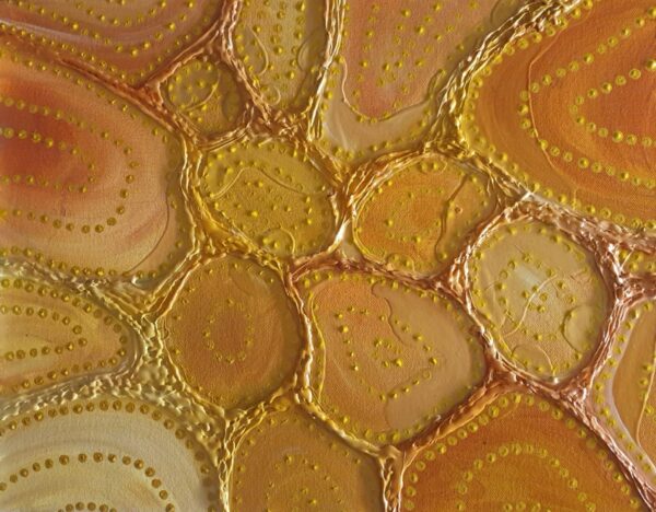 The texture on this painting replicates the human touch on the caves walls, the golden dots represents its colours when touched by the sunlight.