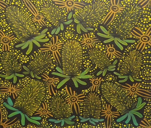 This painting represents the Banksia marginata, commonly known as the silver banksia that grows along the shore of Moffat Beach.